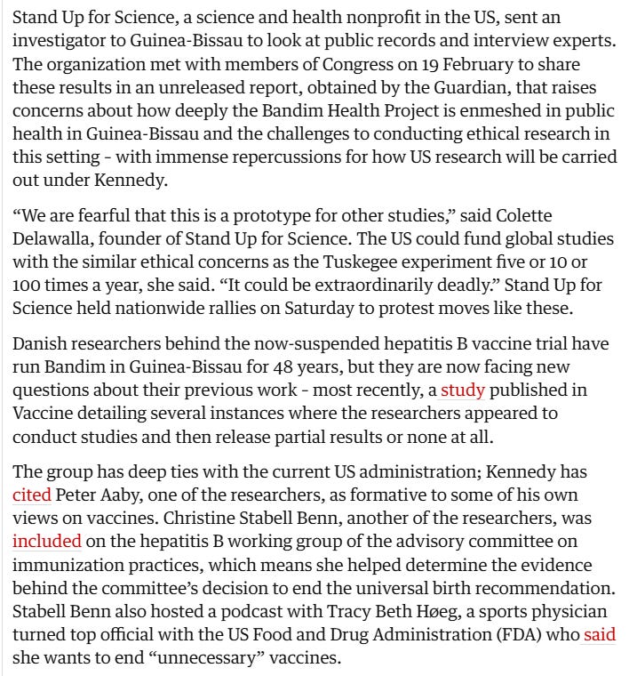 Meanwhile in Africa, some folks were providing an important vaccine to half the babies, a shocking reminder of the 40 year Tuskegee Experiments … till a science group intervened.