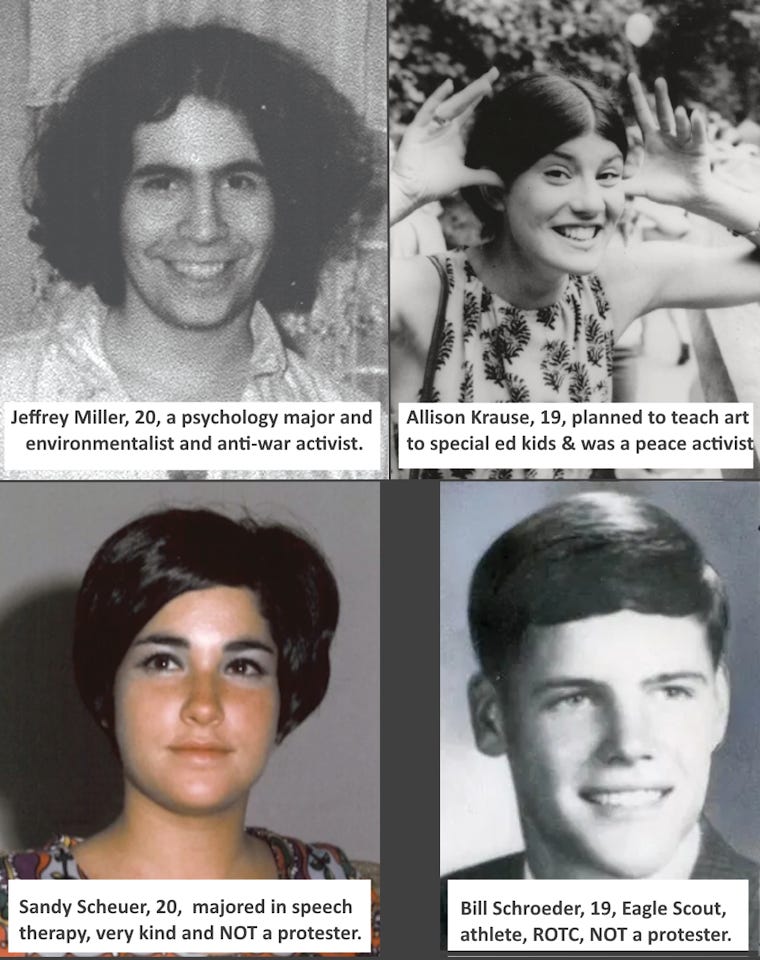 Compare that to Kent State 27 months later. Two of the four dead weren’t even protesting the Vietnam War. Allison Krause wasn’t aggressive in any way, having peaceful conversations with the Ohio National Guard the day before they shot her.