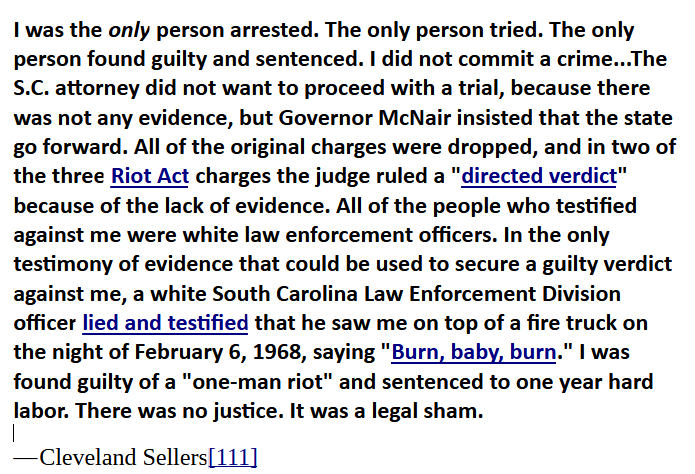 Reporters described it as a gun battle, a riot, and mainly reported misinformation provided by local police and Governor McNair’s office. His spokesman claimed Sellers was "the main man. He's the biggest nigger in the crowd."